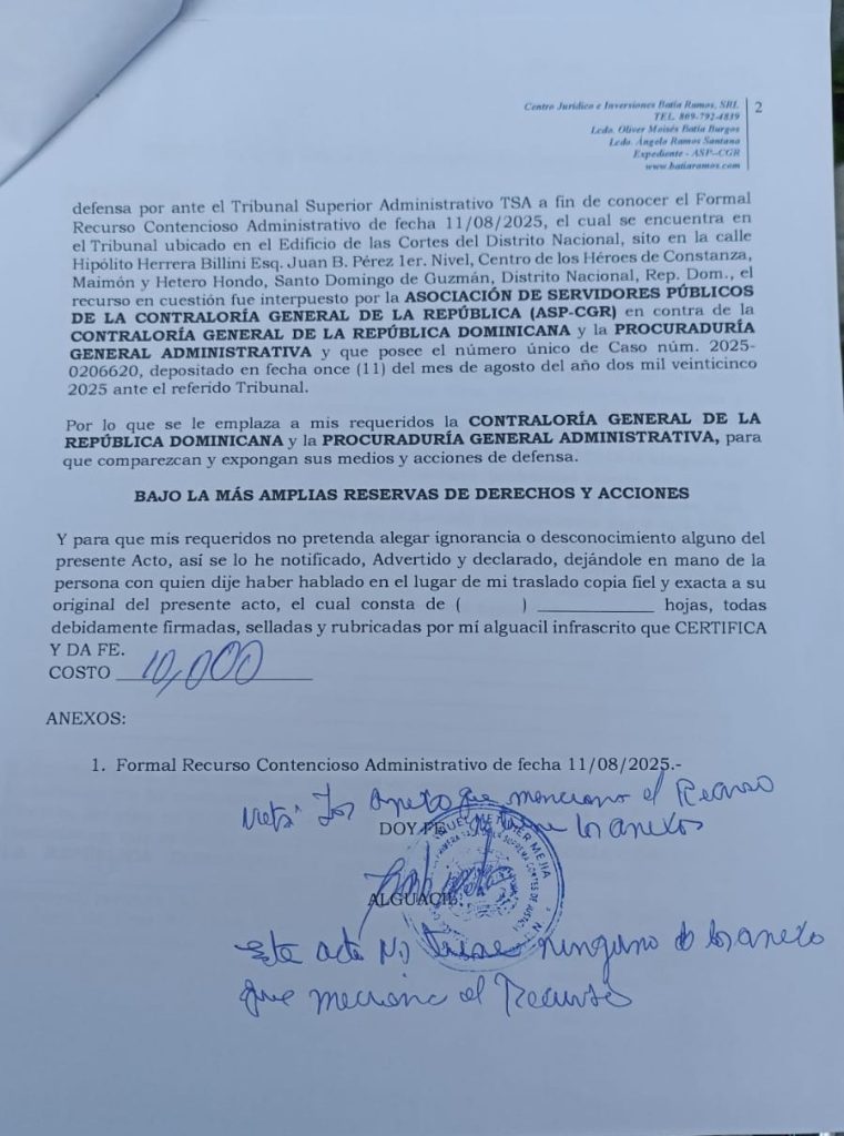 La Asociación advirtió, a través del acto administrativo, que este caso podría abrir la puerta a nuevas demandas contra el Contralor Félix Antonio Santana García, la Dirección General de Presupuesto y su director José Rijo Presbot, así como contra el Ministerio de Administración Pública, por su complicidad en la retención ilegal de derechos adquiridos.