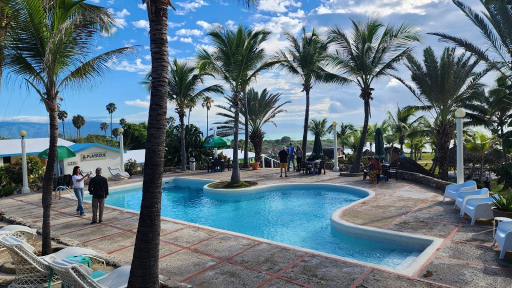 A las 5:34 pm llegamos súperexhaustos al hotel Playa Azul, una bonita edificación con habitaciones de matiz campechano, piscina, atenciones súperamables y una terraza donde me tomé unas frías. En realidad es un hotel de algunas 3.5 estrellas, pero con higiene y atenciones de 5. Luego de tomar un baño pedí un trago de alcohol por el chat, a lo que Milka e Isaac me ofrecieron isopropílico, pero no entendieron que yo deseaba etílico (risas, Isaac me llevo algo como Lysol). Luego de un breve descanso el colega Alcides Nova y yo disfrutamos de la piscina bajo una copiosa llovizna y luego llegó la hora de salida.
