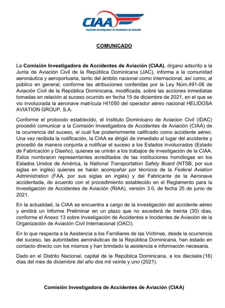 La Comisión Investigadora de Accidentes de Aviación (CIAA), órgano adscrito a la Junta de Aviación Civil de la República Dominicana (JAC), informa a la comunidad aeronáutica y aeroportuaria, tanto del ámbito nacional como internacional, así como, al público en general, conforme las atribuciones conferidas por la Ley Núm.491-06 de Aviación Civil de la República Dominicana, modificada, sobre las acciones inmediatas tomadas en relación al suceso ocurrido en fecha 15 de diciembre de 2021, en el que se vio involucrada la aeronave matrícula HI1050 del operador aéreo nacional HELIDOSA AVIATION GROUP, S.A.