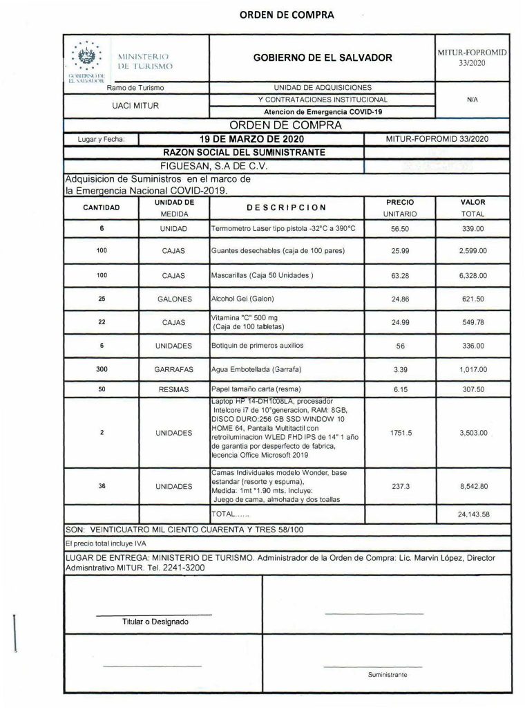 La corte identificó el sobreprecio en una compra total de $24,143.58 que le hizo Mitur a ese proveedor. Seis termómetros láser, 25 galones de alcohol gel, 36 camas individuales, dos laptops, 22 cajas de vitamina C, 50 resmas de papel tamaño carta, entre otros productos fueron comprados por el Mitur a Figuesan.
