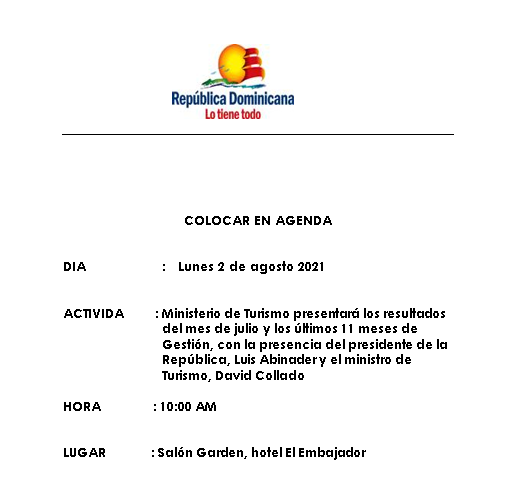 Este lunes 2 de agosto el Ministerio de Turismo presentará los resultados del mes de julio y los últimos 11 meses de gestión, con la presencia del presidente de la República, Luis Abinader y el ministro de Turismo, David Collado.