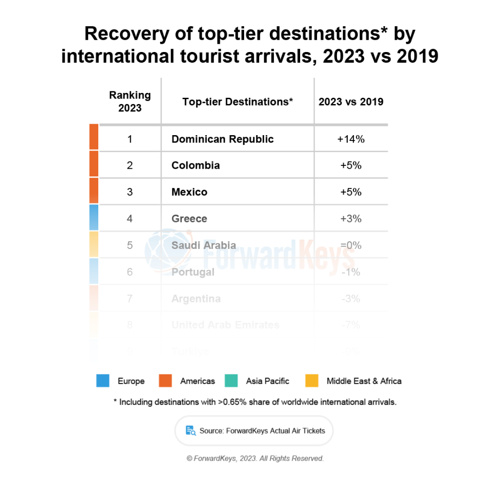 En 2023, sin embargo, surgirán patrones de viaje más diversos. La República Dominicana, México y Grecia aún mantienen posiciones altas, pero la combinación es más variada en general, con Oriente Medio y África (MEA) particularmente bien representados entre los países con mejor desempeño.