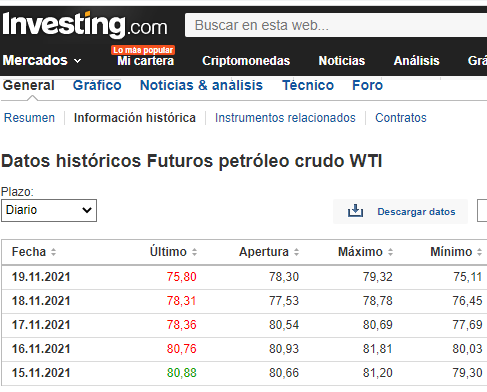 Alrededor de las 2:20 pm de este viernes, el precio de un barril del petróleo WTI hoy operaba a 75,80 dólares, perdiendo aproximadamente 5,08 USD, frente al cierre de la cotización WTI del lunes en la bolsa de Nueva York.