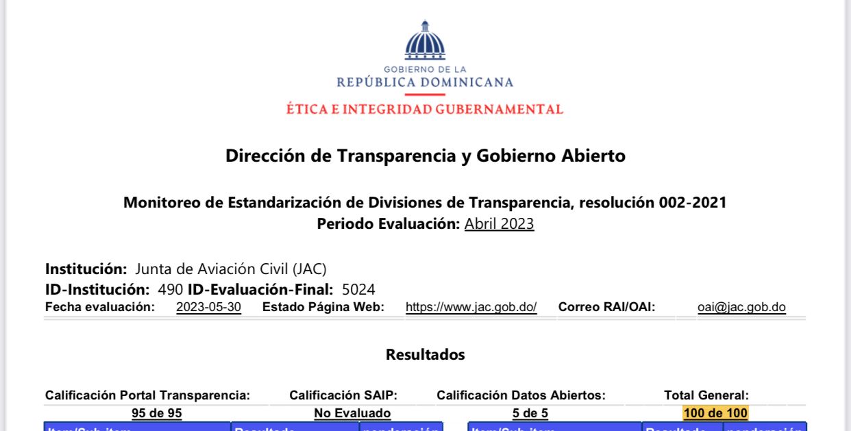Santo Domingo. República Dominicana. 12 de junio 2023.- La Dirección General de Ética e Integridad Gubernamental (DIGEIG), órgano rector en materia de ética, transparencia, gobierno abierto, y libre acceso a la información, en el ámbito de la administración pública, otorgó 100 puntos, la máxima calificación, al portal de transparencia de la Junta de Aviación Civil (JAC), en su más reciente evaluación correspondiente al mes de abril de este año.