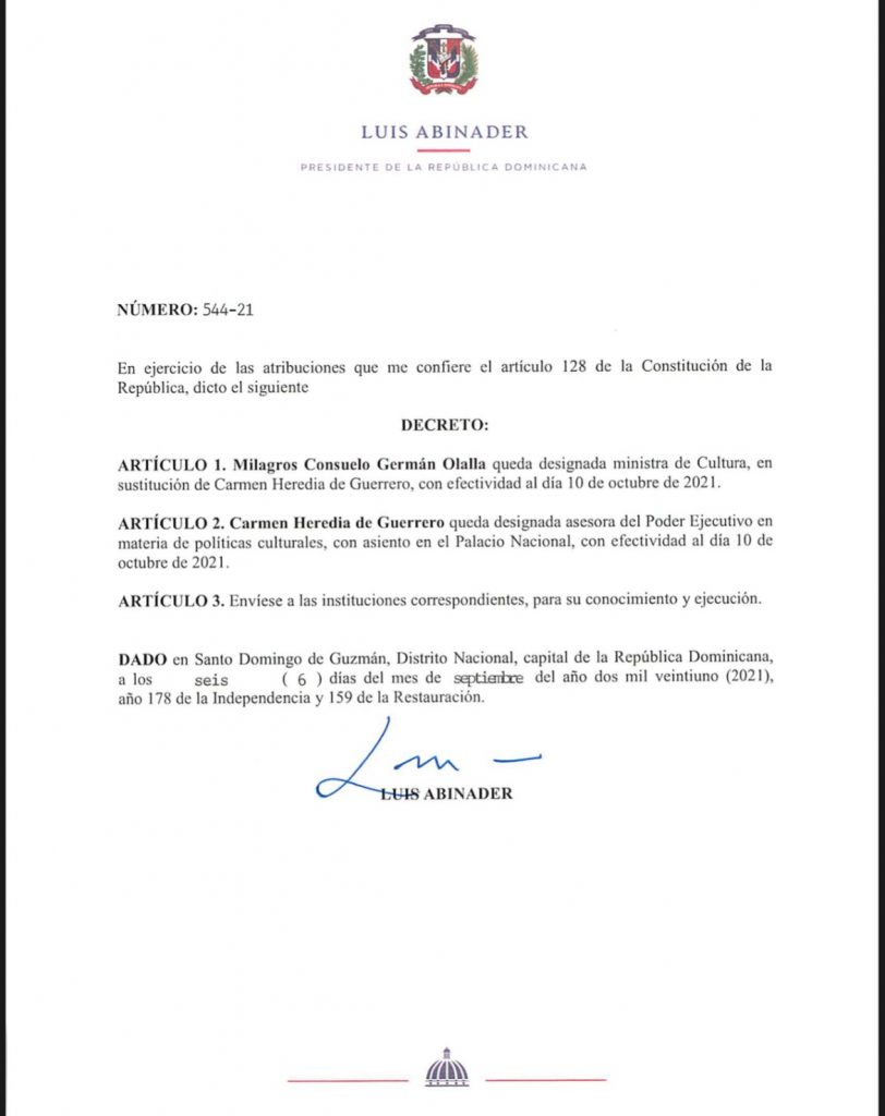 Santo Domingo.- El presidente Luis Abinader designó a Milagros Germán como ministra de Cultura, en sustitución de Carmen Heredia de Guerrero.