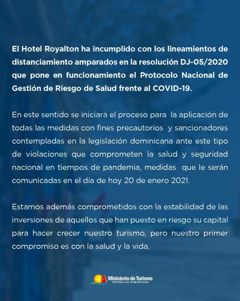 «Nuestro principal compromiso es con el bienestar y salud de nuestra gente y los turistas que nos visiten. Estamos apostando a una recuperación de turismo responsable y no permitiremos ningún incumplimiento que ponga en riesgo los logros que hemos alcanzado hasta el momento», dijo Collado.