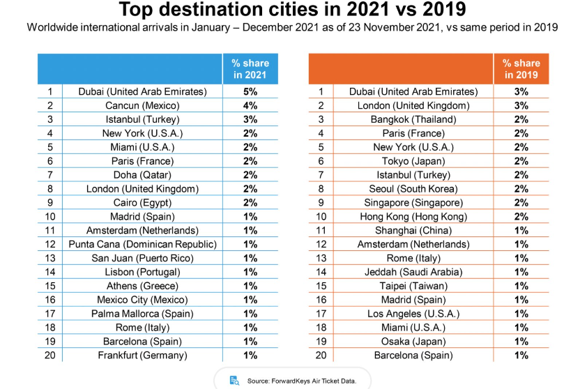 Se trata de una comparación de las principales ciudades de destino del mundo, realizado por analistas de ForwardKeys, antes de la pandemia en 2019 y en 2021, mostrando la tendencia de los viajes de placer hacia la recuperación.