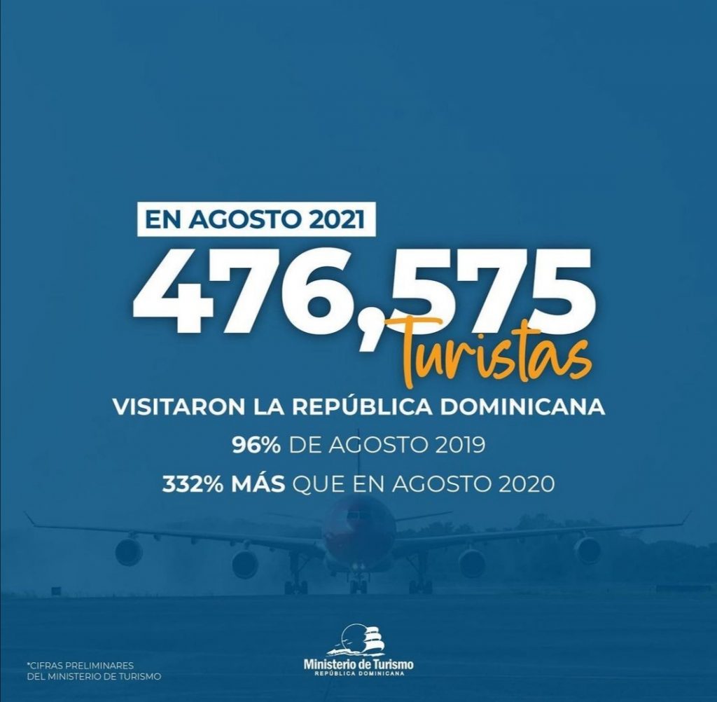 «El progreso de la República Dominicana se refleja día a día en cada dominicano, agosto recibió 476,545 turistas no residentes haciendo que el total de visitantes para este 2021 sea de 2,938.200. Estamos recuperando al país, la economía y la esperanza de cada uno de ustedes», posteó Collado en Twitter.