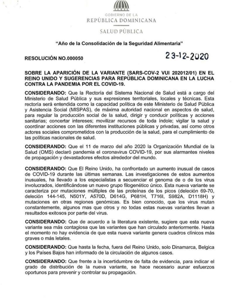“Dejamos aquí la Resolución 000050 del Ministerio de @SaludPublicaRD , donde se explica que pasajeros procedentes de vuelos especiales desde Gran Bretaña y sus territorios estarán 7 días en cuarentena y bajo observación”, señala el comunicado de la institución.