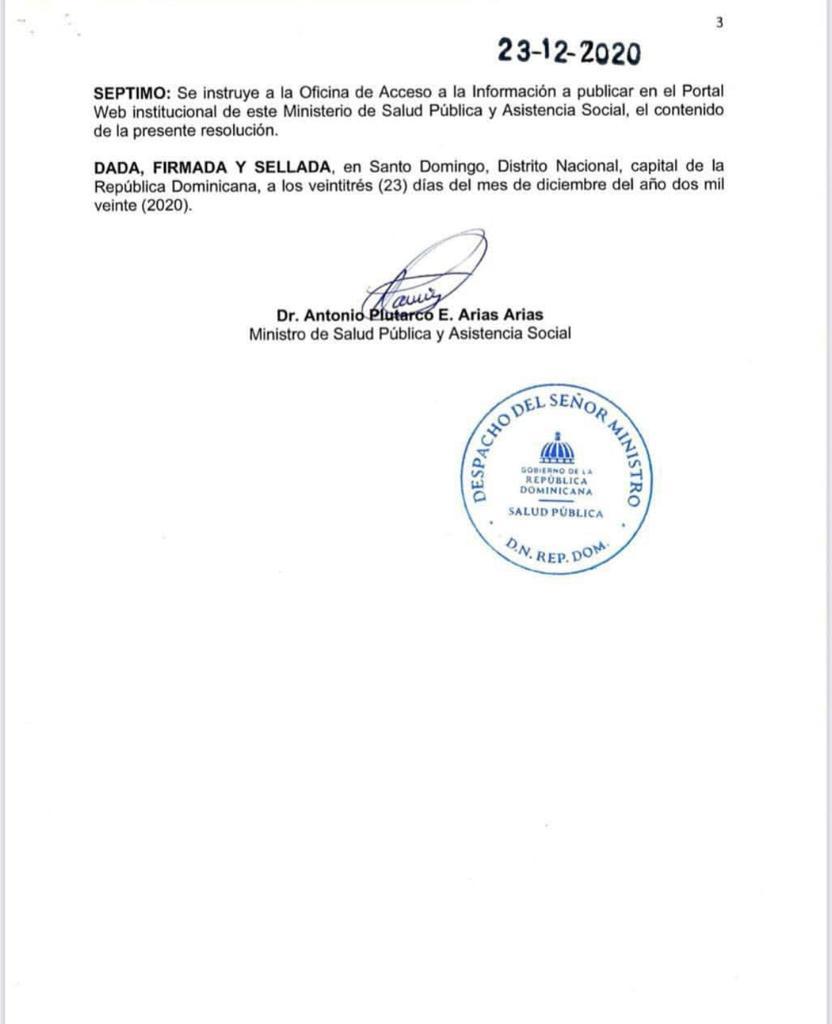 También, la entidad ordena a las autoridades correspondientes proceder a implementar las medidas contenidas en la resolución de manera inmediata en todas las fronteras, aeropuertos y puertos de embarques de la República Dominicana.