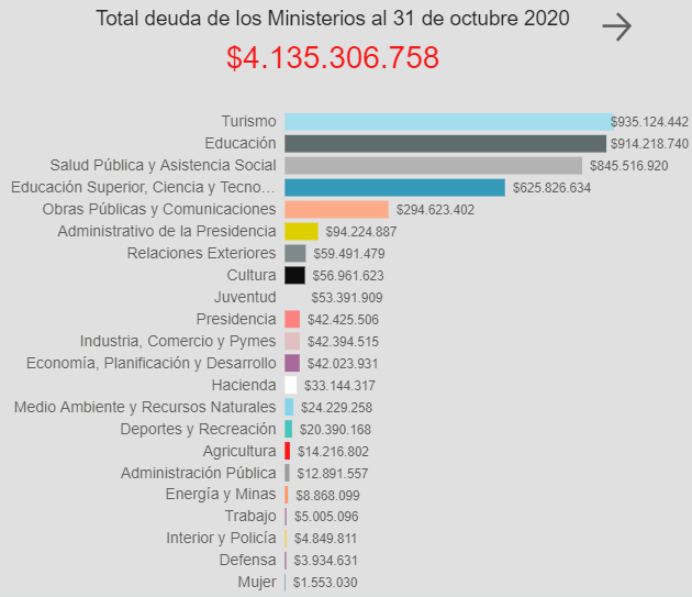 Al cierre de octubre del 2020, las deudas por pagar a los proveedores solamente desde los ministerios, ascendía a RD$ 4,135 millones. El Ministerio de Turismo es el que acumulaba la deuda más alta, con RD$ 935,124,442.