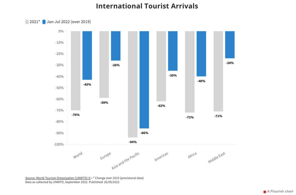 Según el último Barómetro OMT del Turismo Mundial , las llegadas de turistas internacionales casi se triplicaron de enero a julio de 2022 (+172 %) en comparación con el mismo período de 2021. Esto significa que el sector recuperó casi el 60 % de los niveles previos a la pandemia . La recuperación constante refleja la fuerte demanda reprimida de viajes internacionales, así como la relajación o el levantamiento de las restricciones de viaje hasta la fecha (86 países no tenían restricciones relacionadas con el COVID-19 al 19 de septiembre de 2022).