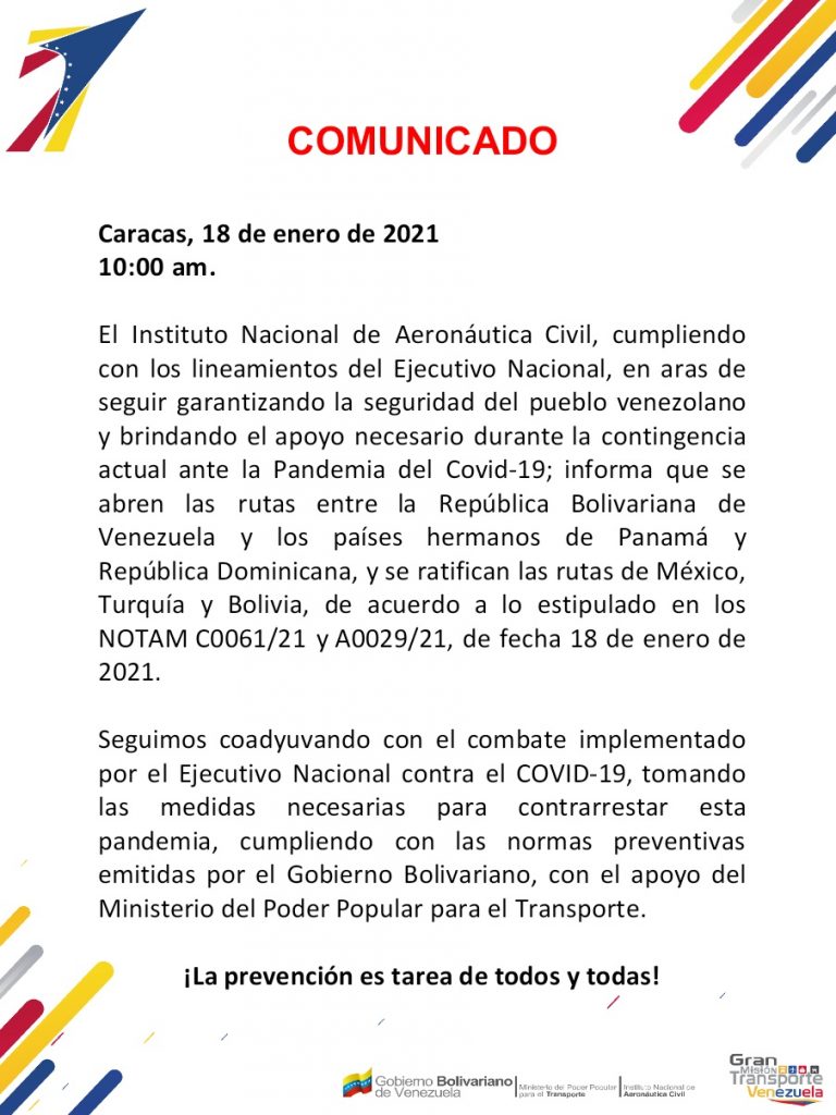 Comunicado || El #INAC, cumpliendo con los lineamientos del Ejecutivo Nacional, informa medidas para el sector aéreo de acuerdo a lo establecido en los NOTAM C0061/2021 y A0029/21.