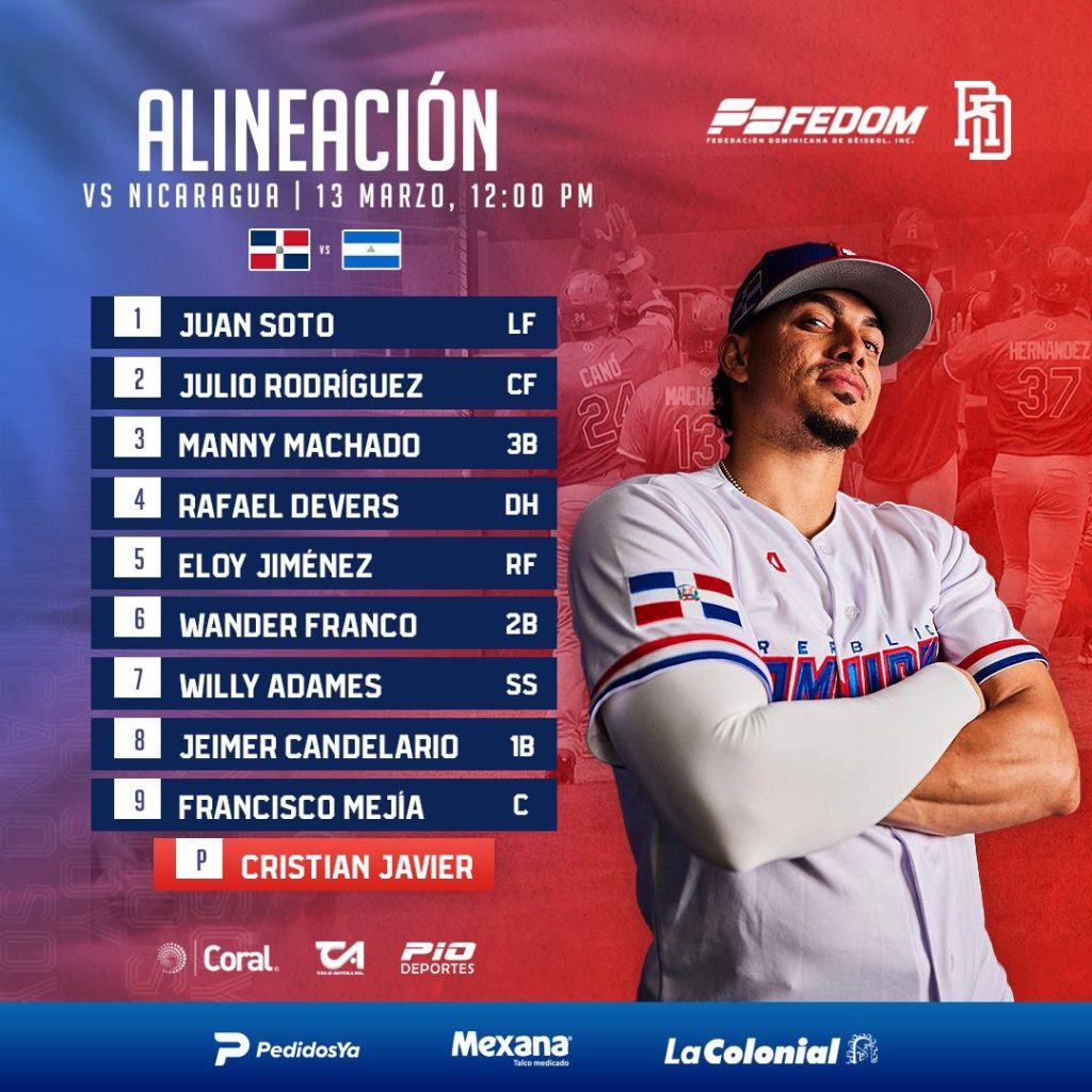 Además, Rafael Devers, pasó de quinto a cuarto, Willy Adames, sustituyó a Jeremy Peña, en el campo corto y Francisco Mejia, está colocado en la receptoría por Gary Sánchez.